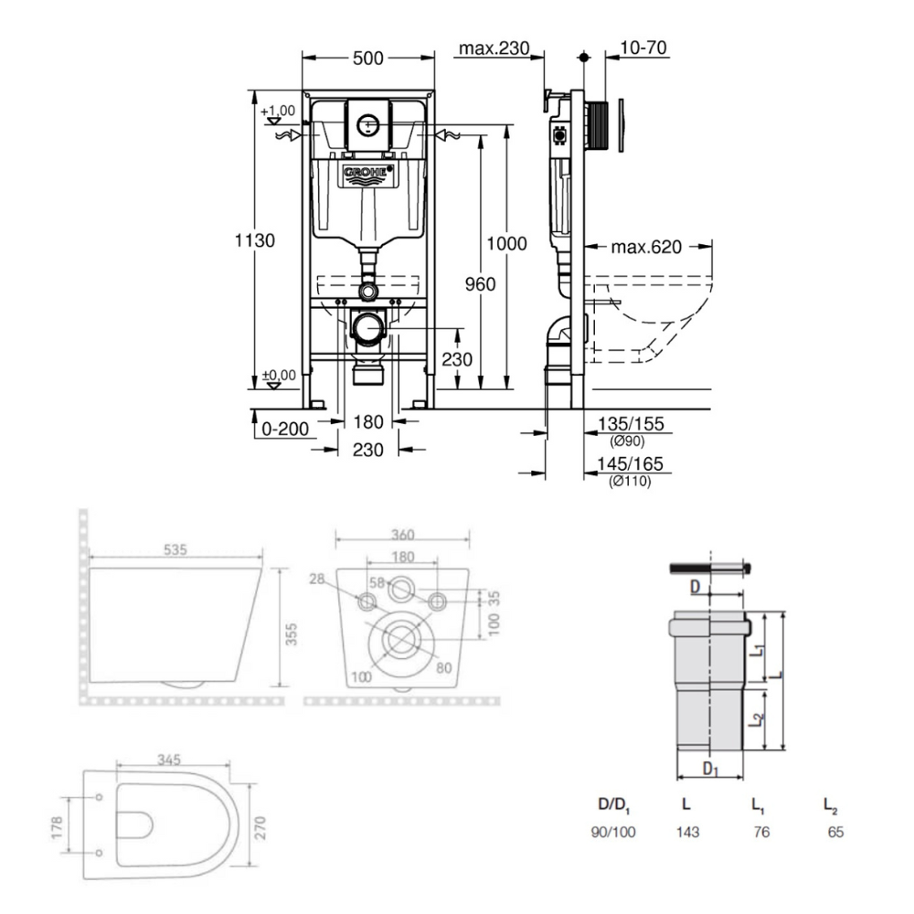 Caractéristiques du pack WC kit bâti-support 4 en 1 Grohe Solido + WC suspendu sans bride Ceramia avec abattant SoftClose + plaque chrome (GRRST14WT01-FR) :