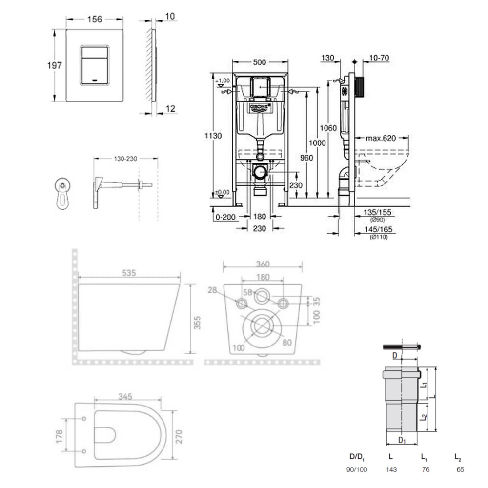 Caractéristiques du pack WC bâti-support Grohe Rapid SL + WC suspendu sans bride avec abattant SoftClose Ceramia + plaque chrome (GRRCE14WT01MAN-FR) :