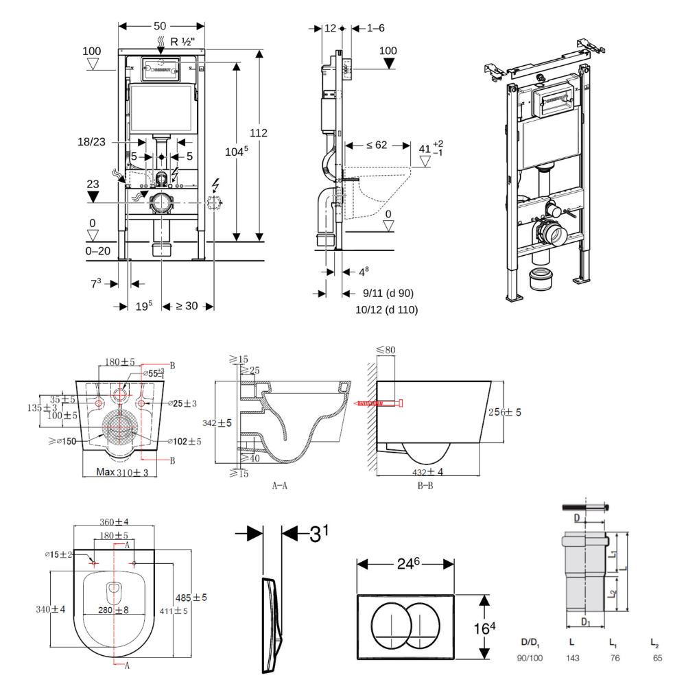 Caractéristiques du pack WC bâti-support Geberit Duofix UP100 112 cm + WC suspendu sans bride avec abattant SoftClose Swiss Aqua Technologies + plaque blanche (GEBSTBRWR01MAN-FR) :