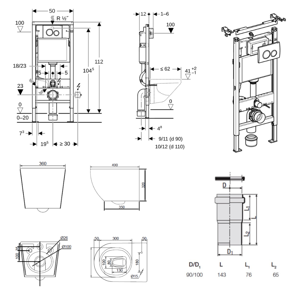 - Geberit Pack Bâti-support Duofix 112cm + Plaque de commande Delta20 blanc alpin + fixations murales (458.134.11.3)