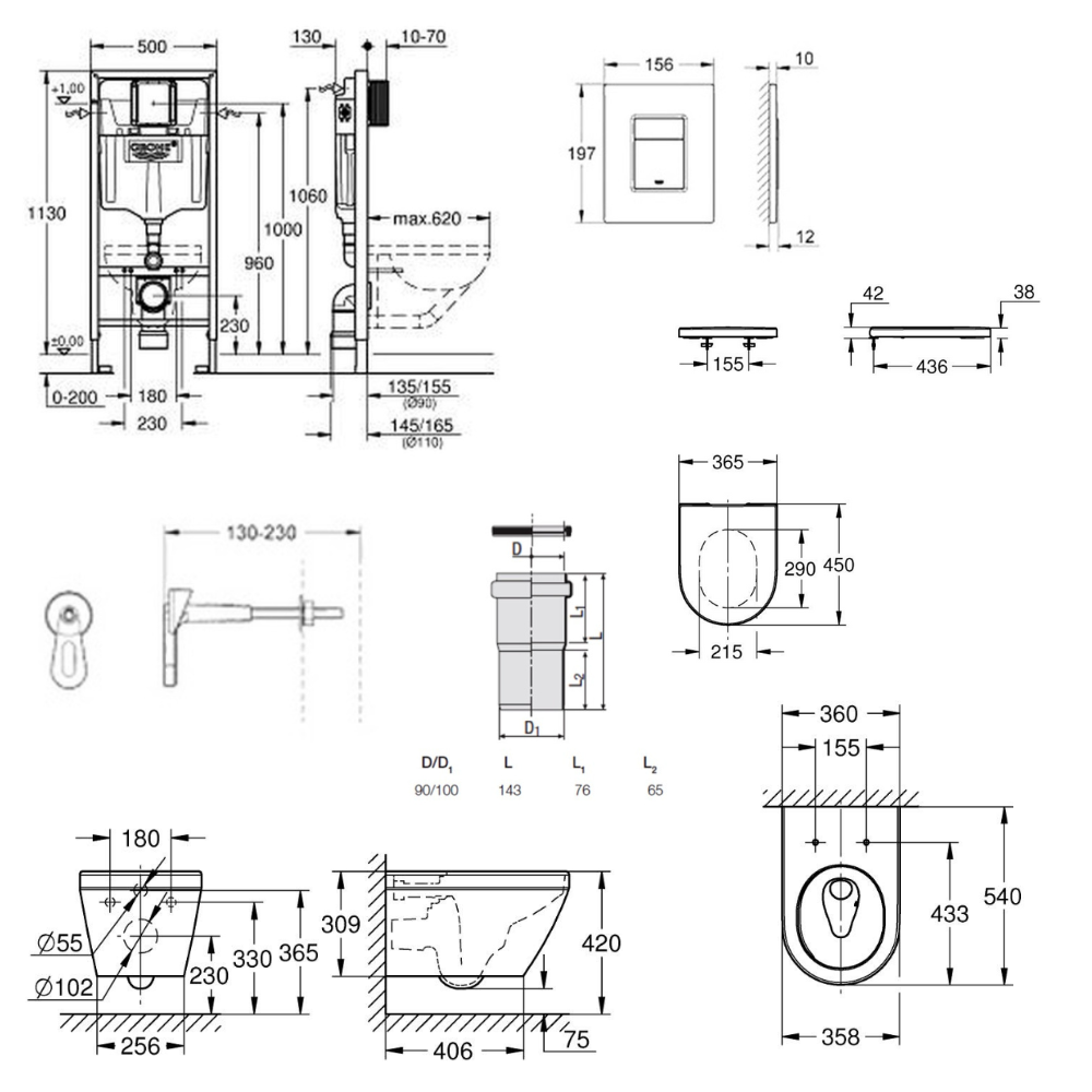 Caractéristiques du pack WC bâti-support Grohe Rapid SL + WC suspendu sans bride Grohe avec abattant SoftClose + plaque (GRGRWR04-FR) :
