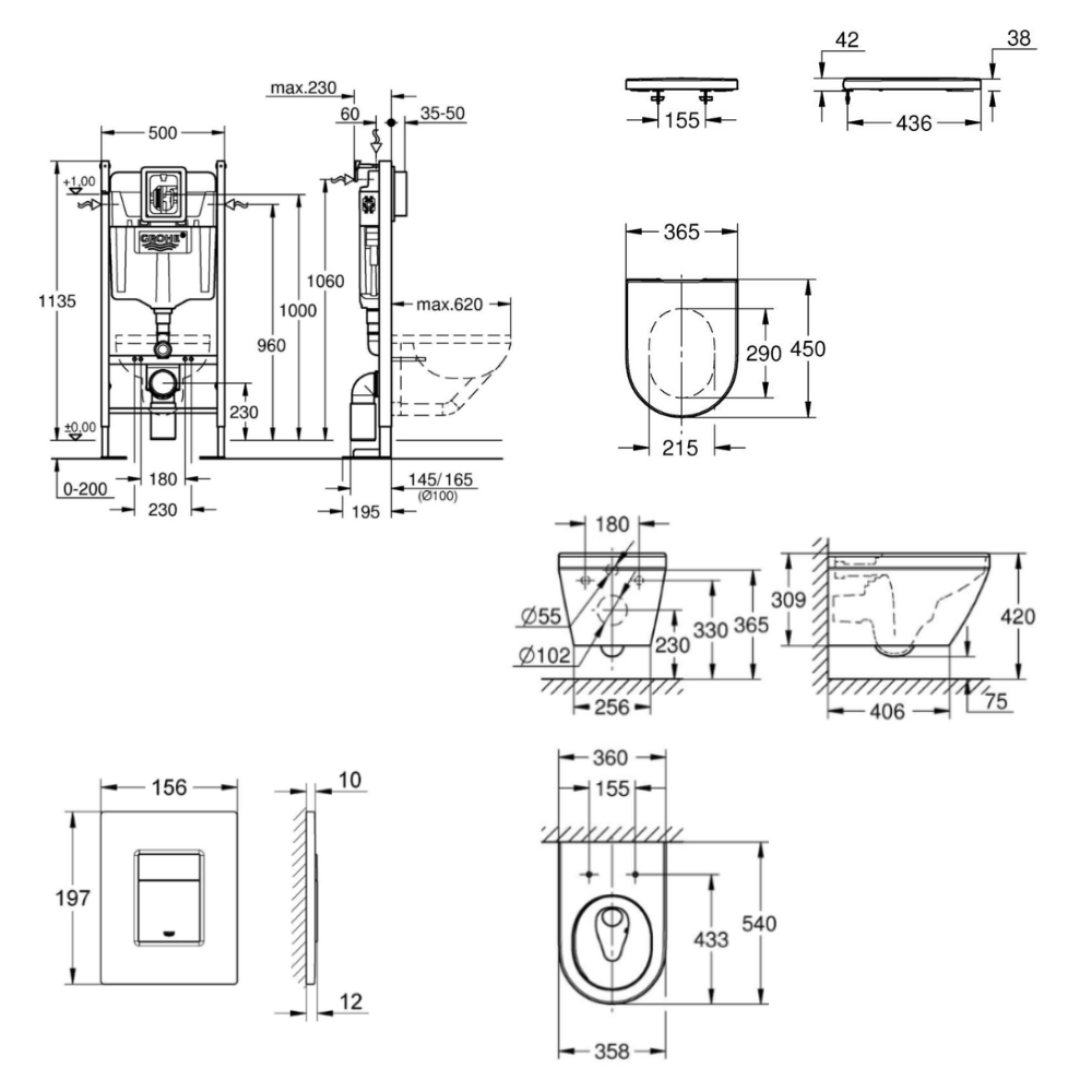 Caractéristiques du pack WC bâti-support autoportant Grohe Solido + WC sans bride Grohe avec abattant SoftClose + plaque chrome (GRGRWR08-FR) :