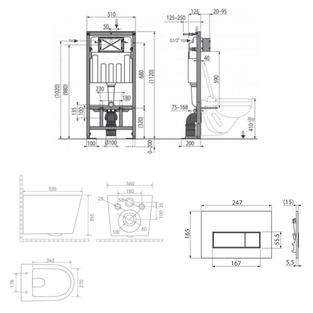 - Pour le montage de cuvettes WC suspendues avec un pas de raccordement de 180 mm ou 230 mm