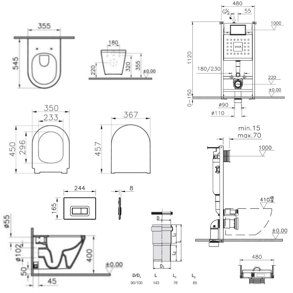 Caractéristiques du Pack WC Bâti-support V-Fix Core + WC sans bride Integra, fixations invisibles + Plaque, Blanc Brillant (V-FixIntegraRimless-1) :