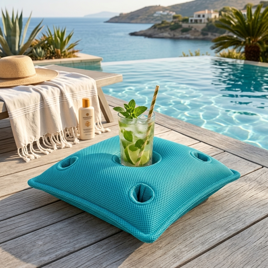 Parfait comme accessoire de piscine, pour la terrasse ou le jardin, ce coussin extérieur flottant permet de garder vos boissons à portée de main tout en profitant de l’eau et du soleil.