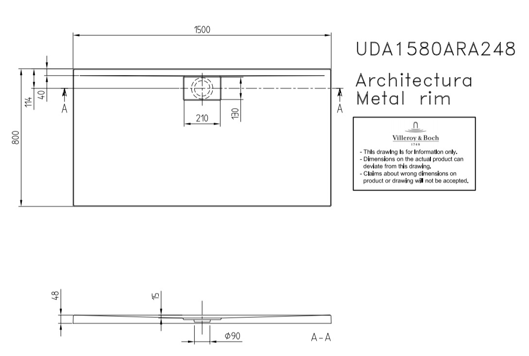 Villeroy & Boch Receveur Architectura Metalrim, 1500 x 800 x 48 mm, blanc (UDA1580ARA248V-01)
