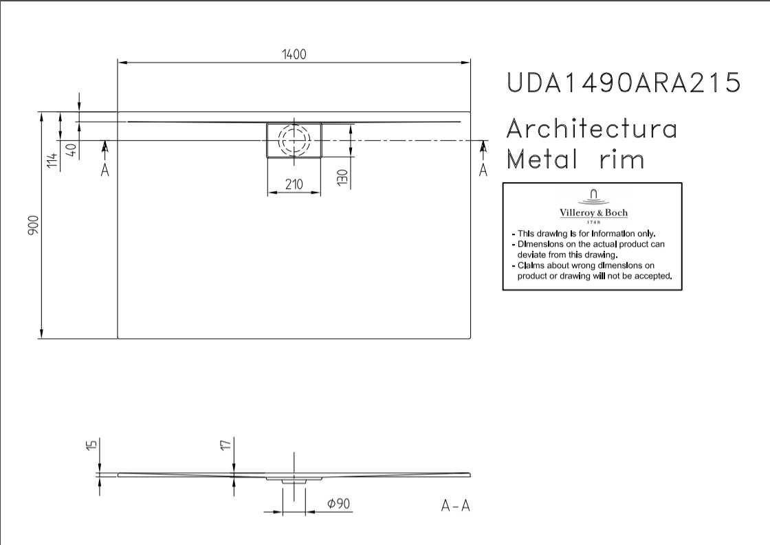 Villeroy & Boch Receveur Architectura Metalrim, 1400 x 900 x 15 mm, Gris UDA1490ARA215V-1S)
