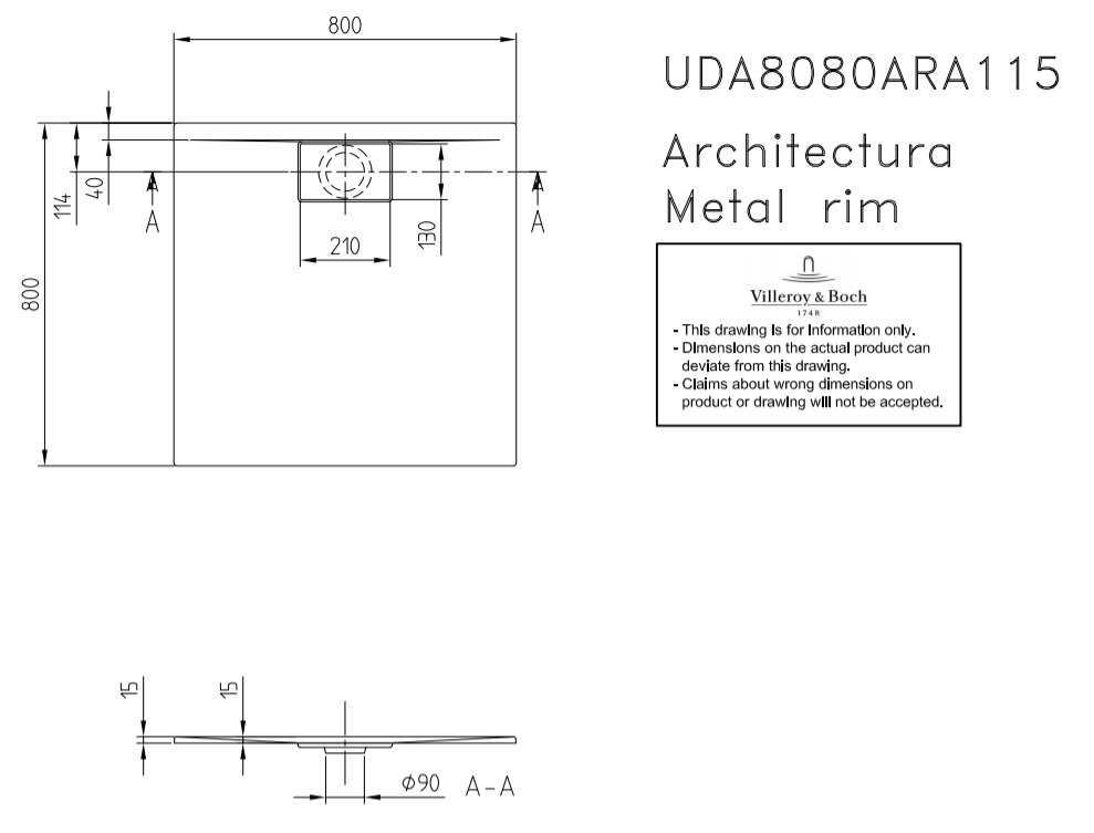 Villeroy & Boch Receveur Architectura Metalrim, 800 x 800 x 15 mm, blanc (UDA8080ARA115V-01)