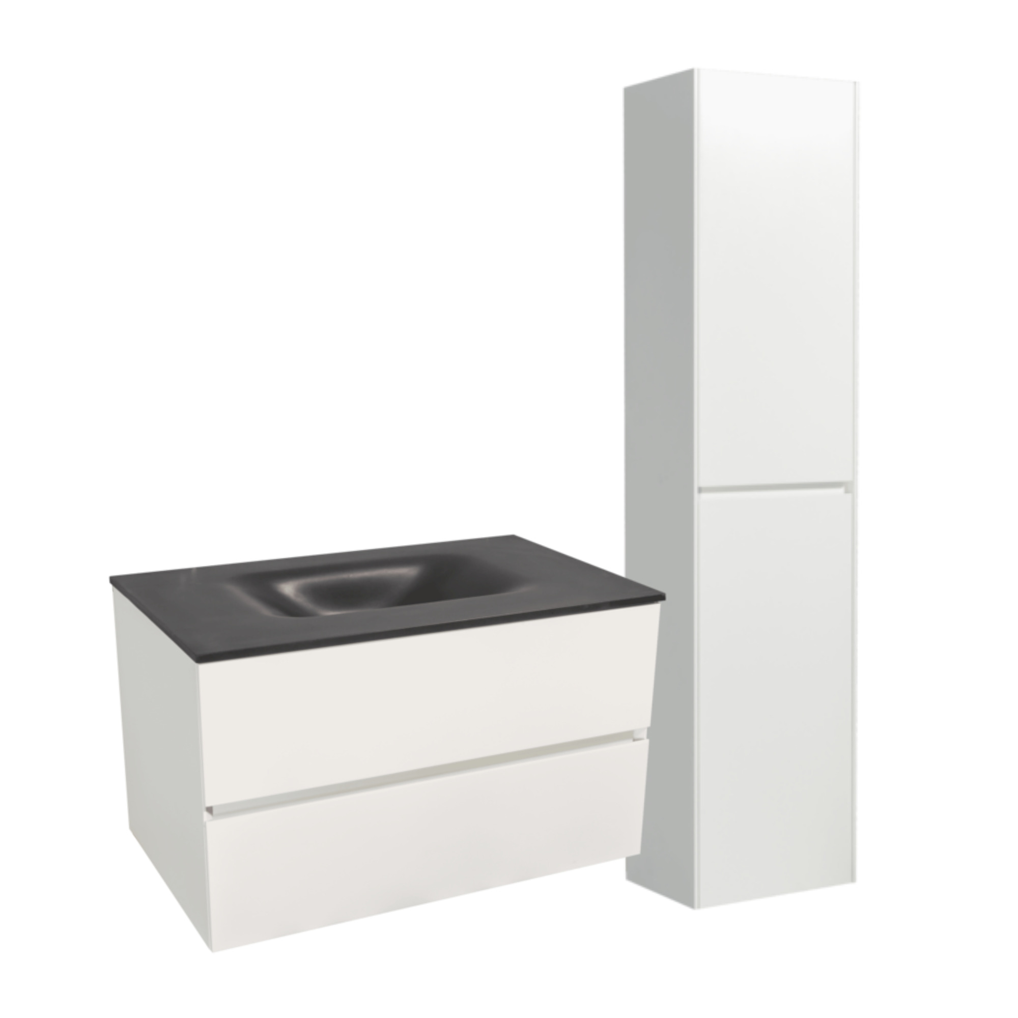 Naturel Set Meuble 66cm suspendu blanc mat avec 2 tiroirs + Vasque en marbre coulé noir + Armoire (Verona66NBB)