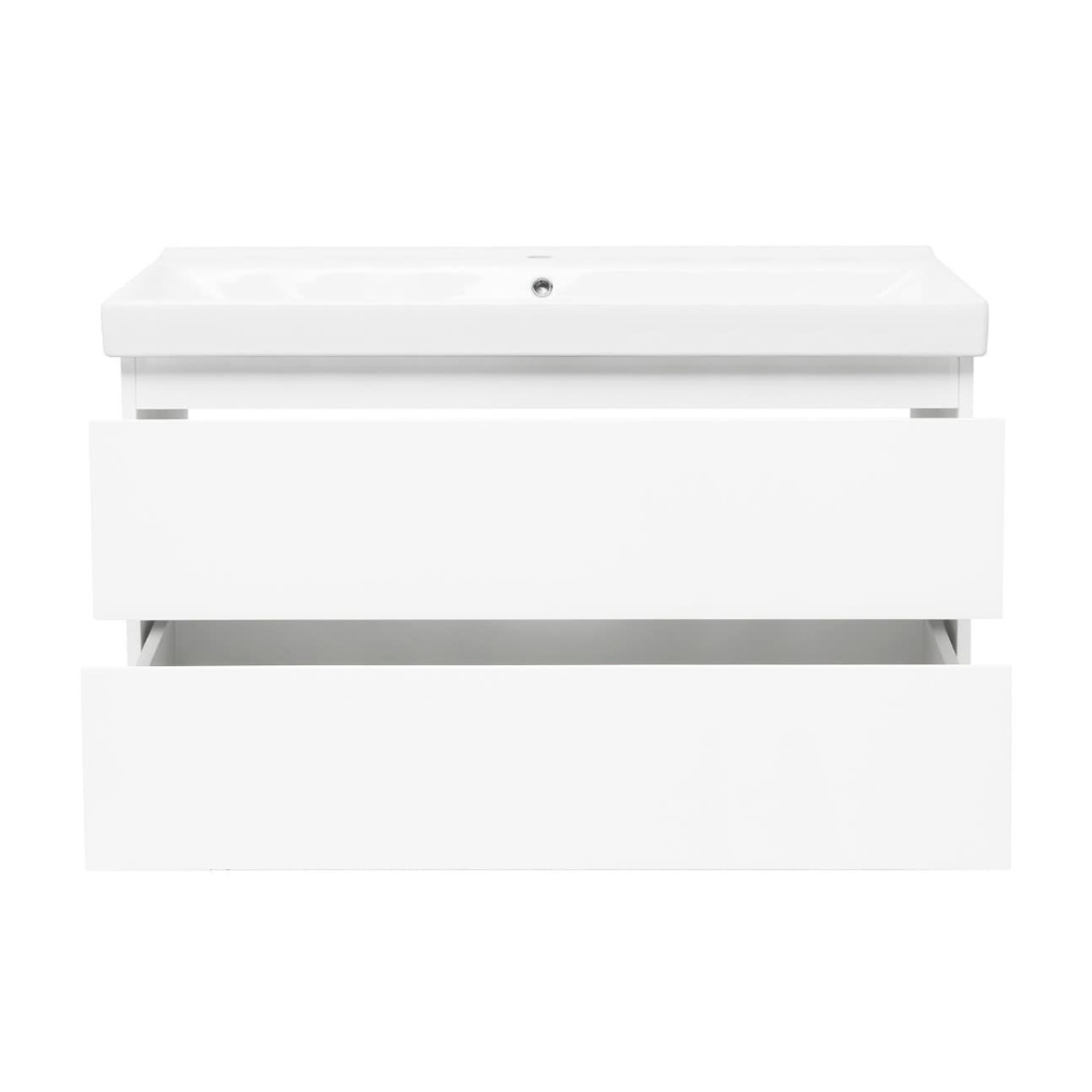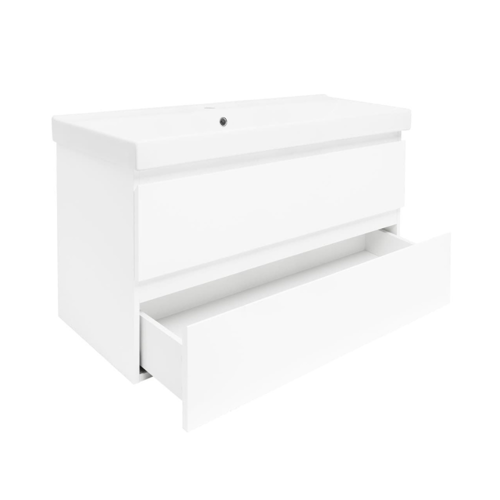 Swiss Aqua Technologies B-Way 99x50x45 cm meuble de salle de bain suspendu 2 tiroirs avec lavabo en céramique, blanc brillant(BWAY2100WU1BI)