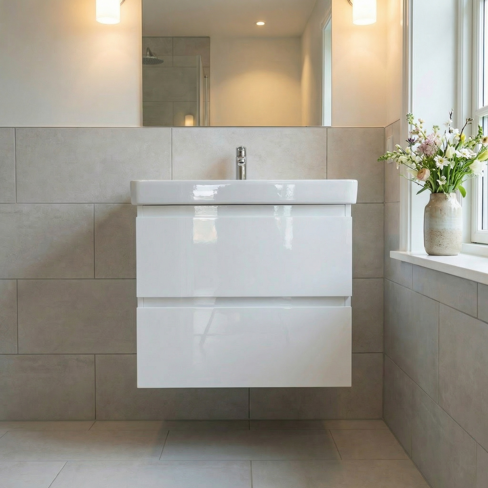 Le lavabo en céramique blanc brillant inclus s’adapte parfaitement au meuble et assure une installation simple, durable et facile à entretenir.
