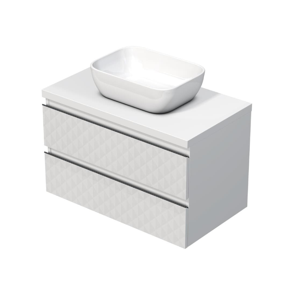 Caractéristiques du meuble de salle de bain suspendu 2 tiroirs 80x47,5x46 cm avec lavabo en céramique et plaque de recouvrement, décoration pyramidale 3D, Swiss Aqua Technologies Cube Way, blanc mat (CUBE3D46802ZBKD) :