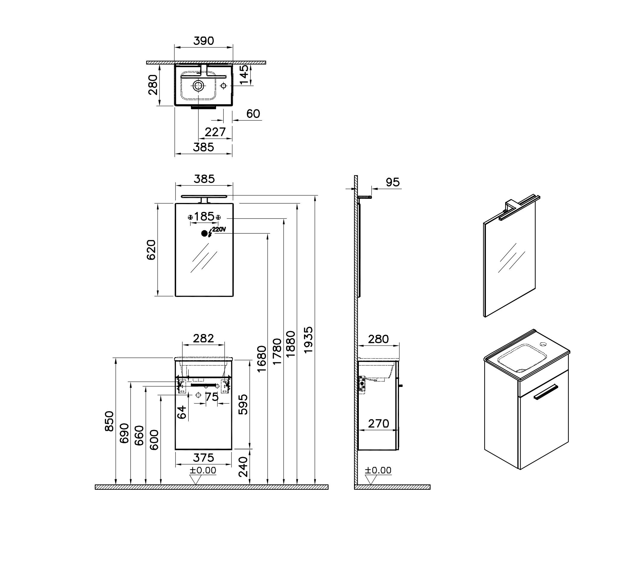 Caractéristiques du Meuble 39x61x28 cm pour salle de bain avec miroir, lavabo et éclairage LED, Blanc brillant, Vitra Mia (MIASET40B) :