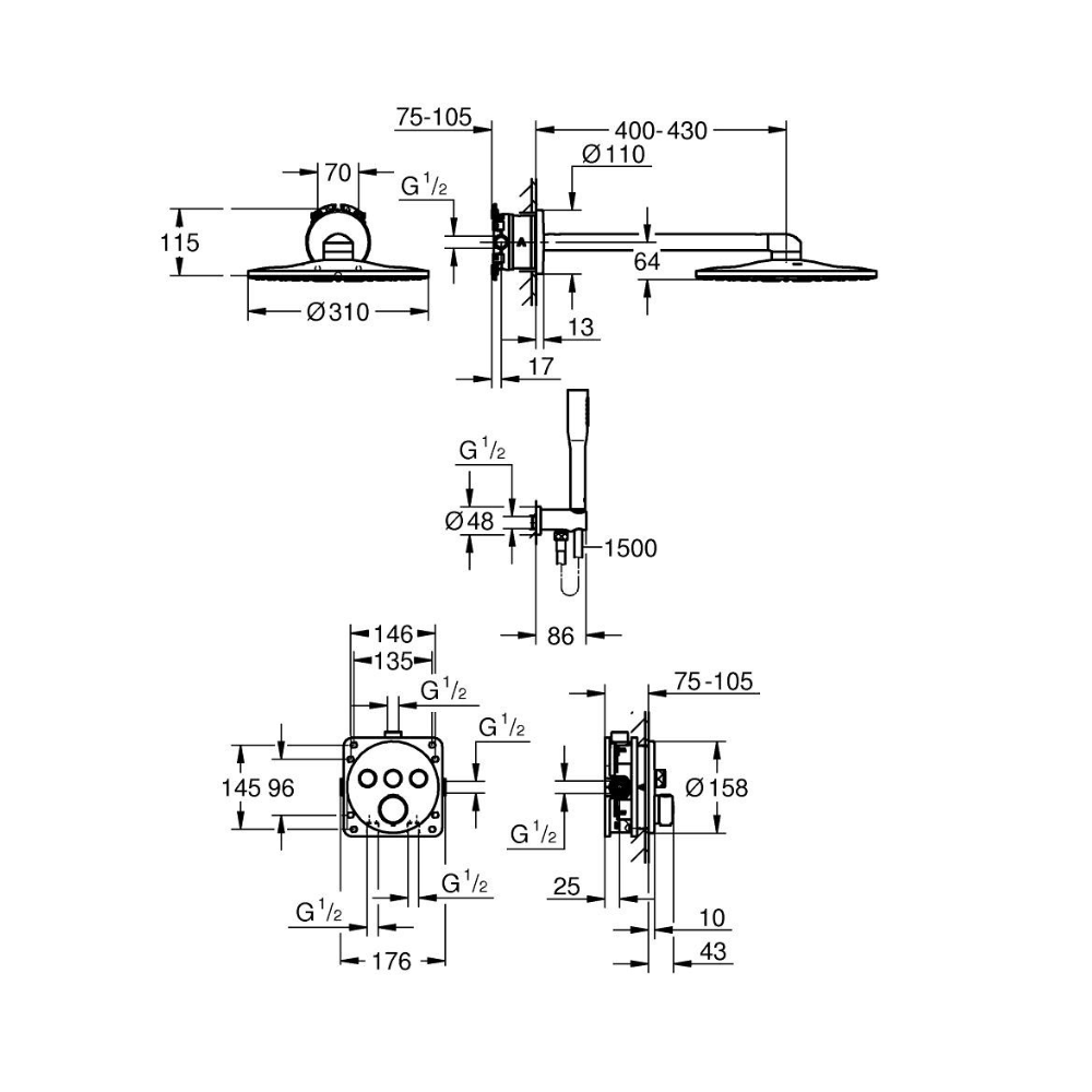 Caractéristiques du Precision SmartControl Set de douche encastrée avec façade thermostatique + Douche de tête 2 jets + Douchette (G34874000) :