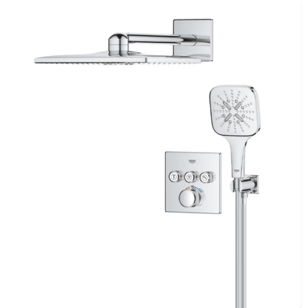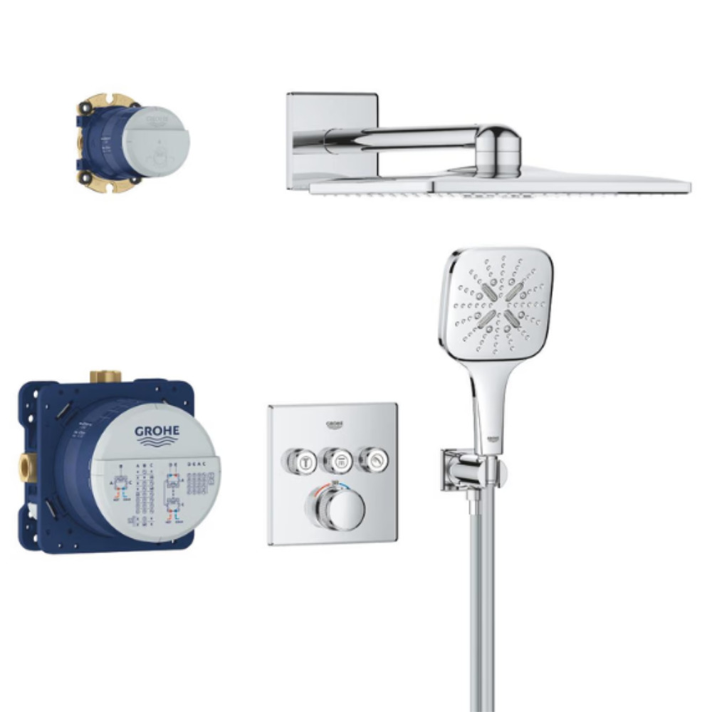 - GROHE SmartControl : commande intuitive dédiée au confort de douche : démarrage, arrêt, réglage ou mise en pause du débit, avec mémorisation des réglages favoris par simple pression ou rotation.