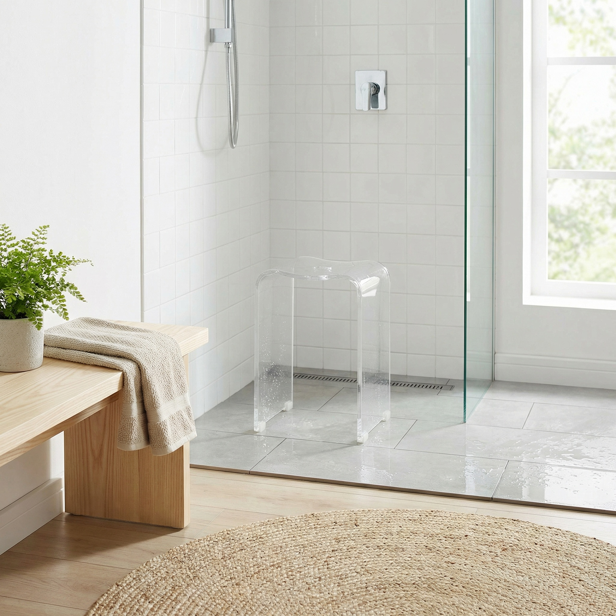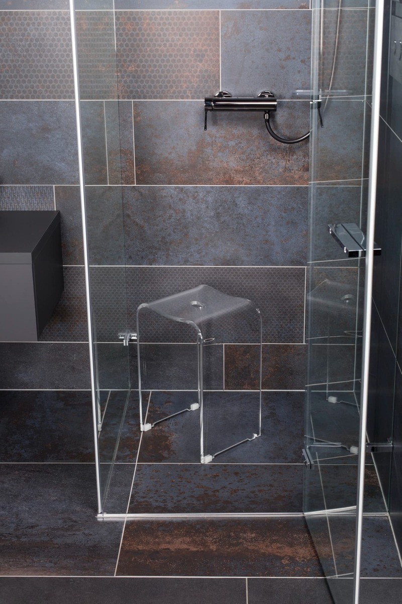 Son design transparent et discret, sans aspect médical, s’intègre naturellement dans la salle de bain ou la douche.