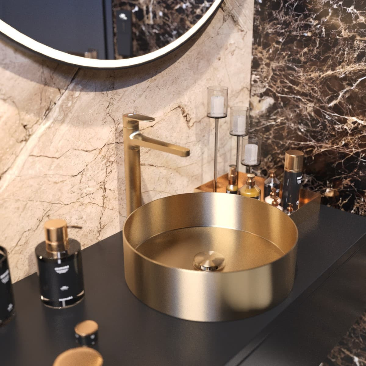 La vasque à poser Aurum en acier inoxydable finition doré brossé 38 x 38 x 11 cm combine design moderne, grande résistance et finition élégante, idéale pour les salles de bain contemporaines. Disponible en plusieurs finitions de la gamme Aurum, elle permet d’harmoniser facilement la vasque avec votre robinetterie et vos accessoires de salle de bain.