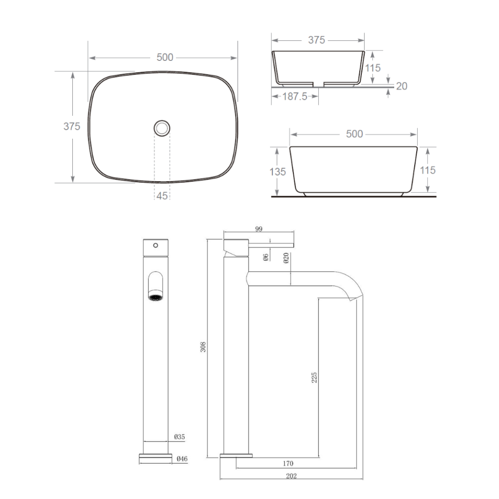 Ceramia Aurum mitigeur lavabo 30,8 cm inox + Ceramia PixL 50 x 37,5 x 13,5 cm vasque à poser, sans trop plein, blanc (SAT285BGCEPX4937)